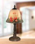 Sweet pink roses are hand-painted in reverse on the back of the bell shaped shade in this lovely little accent lamp. Made for small spaces where you might need a touch of lighting, there is nothing small about our artisans’ attention to detail in the quality and craftsmanship you have come to expect from Dale Tiffany. The roses and greenery, which are set against a light amber background are so lifelike, you will find yourself looking out for thorns. A carved metal base, finished in antique bronze rounds out the vintage look of this exquisite little lamp.