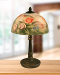 Groupings of plum colored roses adorn an alabaster bell shade on this table lamp from our Glynda Turley series. A decorative column pedestal with a round base is finished in antique bronze. This lamp is the perfect choice for a bedroom, living room or den or anywhere you want a beautiful lighting option with a distinctive Victorian feel.