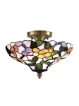 This pretty Peony Semi-Flush Mount fixture will be a breath of fresh air in any room in your home. The lovely tapered inverted shade features a bright white background. A lush green vine of bright peony blossoms in blue, yellow, and mauve wanders throughout the shade. Each flower is tucked away amidst lush green foliage. Watery blue accents throughout add extra shimmer and texture. Each piece of glass is hand rolled and individually copper foiled using the same technique first developed by Louis Comfort Tiffany in the Nineteenth Century. The fixture hangs from an elegantly simple metal ceiling canopy and center support tube, making it the perfect choice over a kitchen table or a pretty bedroom or foyer.