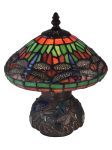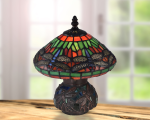 Blue dragonflies seem to be flying at sunset in our red dragonfly shade. Set side by side, each dragonfly features ruby red crystal “eyes” and are set on a background of firry red and orange with green foliage. The dragonfly theme is continued in the antique bronze base, with dragonflies flitting about on a field of flowers set against a blue and green wheat mosaic background. An intricately carved matching finial at the top of the shade adds just the right finishing touch.