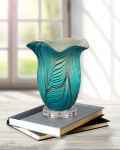 The accent lamps in our Favrile Art Glass Collection combine the one of a kind artistry of hand blown glassware with a functional light fixture for a look that is uniquely yours alone. Once again, our designers have called upon Louis Comfort Tiffany’s love of nature for their inspiration on our lovely Loyola accent lamp. Favrile differs from other art glass because the colors are embedded within the glass itself, ensuring that no two pieces are quite the same. The gently scalloped shade is a deep green blue with a leaf pattern blown into the glass. A tranquil addition to any home, Loyola makes a thoughtful gift for you or for that special someone.