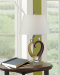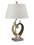 This lovely Table/Heart Set does double duty as both functional table lamp and one of a kind objet d’art. The table lamp features a sleek metal center column and square pedestal, both finished in smooth Polished Nickel. We added a flared shade to complete the contemporary look of the lamp. On the base, A pair of stylized lovers in light and dark amber Favrile art glass are intertwined to form a freeform heart that sits atop a square pedestal of clear glass. The Favrile process embeds the color within the glass itself, allowing for subtle variations in tone and texture, This means that no 2 pieces are exactly alike and that yours is a one of a kind work of art. A lovely wedding or anniversary gift, our Table/Heart Gift Set