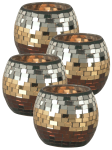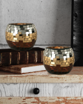 This 2 piece Chalet Mosaic Candle Holder set, from our Copper/Gold/Silver Series is an easy way to add a touch of sparkle to any decor style. Matching votive holders each feature 3 rows of glittery copper, gold and silver art glass, which is hand set in a mosaic pattern. Bright and shiny, these candle holders will cast showers of rich sparkles about the room when you place a lighted candle inside. A perfect gift for yourself of the candle lover in your life, our Chalet Mosaic Candle Holder set will add a luxurious touch of color and shine to any room for years to come.