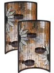 Our Sunflower Candle Holder is a lovely touch of springtime that adds a warm touch of color to any decor year round. The rectangular candleholder is gently curved to allow it to stand upright. The background is a blending of ambers, silver, white and black that features a pair of white sunflowers with black centers peeking out from either side. The entire scene is created of art glass pieces set in a mosaic fashion that is outlined in black. A trio of metal tea light holders is staggered vertically. The light from the tea lights (candles not included) will create an allover sparkle when the candles are lit to cast a warm shimmer throughout the room. A lovely addition to any room, our Sunflower Candle Holder also makes a very thoughtful gift for any occasion.