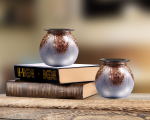 This lovely Cambridge vase crafted from hand blown Favrile art glass in lavender, swirled with a copper and black crackle pattern will bring the grand beauty of Favrile at a price easily afforded by all. Beautiful on its own, this delightful little vase is the perfect size for a small nosegay of your favorite flowers. It also makes a creative pencil or office utensil holder. Perfect for any decor style, this makes an excellent gift for a treasured friend or favorite teacher. 6.5” W x 6.25” H.