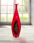 The vibrant colors of our Roseville Vase ensure it is a standout in any room in your home. Standing just under 2 feet in height, the vase features a background of fiery orange that immediately captures the eye. At the center is an oval of black, amber and gold glitter that seems to jump off the vase’s surface. Roseville features a long neck that tapers to a narrow mouth that is surrounded by a wide lip in white that provides additional contrast and visual interest. Roseville is crafted of hand blown Favrile art glass. Because the Favrile process embeds color within the glass itself, no 2 pieces are exactly alike. This means that yours is a one of a kind work of art that is also a functional way to display your favorite flower. A perfect centerpiece on a large dining our Roseville Vase is tall enough to use as a floor vase,