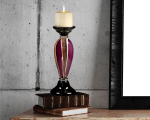 Our Melrose Series of Favrile art glass giftware is crafted using bold, sophisticated styling that will complement any decor in your home. This exquisite candleholder, which stands a stately 15” in height is a stunning way to display your favorite pillar candle. The candle cup and base are mirror images of each other in deep, rich purple. The column features alternating vertical bands of the same dark purple along with light mauve and a swirled band of green, gold and amber. Each of the colored bands is separated with crisp white, which makes the design pop off the surface. A lovely bridal or housewarming gift, this candleholder is beautiful displayed on its own. Try displaying in multiples or paring it with the smaller version, Item #AG500288 for a truly stunning effect.