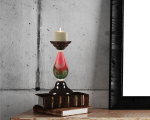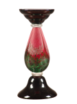 Our Pink Flamingo Candle Holder features a colorful art deco flair that will beautifully enhance any decor. The generously sized center column is a teardrop crafted of hand blown Favrile art glass. The teardrop is bright flamingo pink near the top that features darker pink vertical accents. The pink blends in waves near the bottom to dark pink that gives way to a mottled green around the bottom. Clear glass disks sit on the top and bottom to separate the flared pedestal and graduated candle cup, both in rich black. The candle cup accommodates a maximum 3” diameter ball or pillar candle (not included). Our Pink Flamingo Candle Holder makes a spectacular centerpiece on a dining table, try displaying it in pairs on a console or buffet for a truly magnificent effect.
