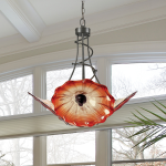 The bold styles and intense colors of our Titan Series will add rich warmth to any room of your home. The series features large floral plates hand-blown in luxurious Favrile Art Glass. Each piece starts with a clear background into which a vibrant series of concentric waves, beginning with gentle light amber at the center which gradually darkens to deep amber at the edge. Our spectacular Titan Series 4 Light Hanging Fixture features a series of 4 matching floral plates tilted outward from the center. Each plate is backlit by a 25W bulb (not included). The plates hang gracefully from 3 curved “stems,” around which wraps a meandering “vine.” The entire fixture is hung from a ceiling canopy, wire cable and decorative chain, making it an excellent choice over an elegant dining table or foyer. No matter where you choose to hang it, our Titan Series 4 light fixture is certain to win rave reviews from your family and friends.