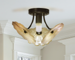 The creamy, soothing tones of our Beige Feather Series will give a tranquil feel to any room in your home or office. Large plates of Favrile Art Glass are hand blown in concentric waves. Because the Favrile Process embeds the color within the glass itself, no 2 pieces are exactly alike. This means that yours is a one of kind work of art. Each of the plates features a gently ruffled edge, giving the feel of a delicate blossom. The plates hang from a sleek canopy and 3 gently curved support rods. Perfect over a casual dining table or used as a pretty ceiling fixture in an entryway or bedroom, our Beige Feather Series will be the perfect final change in any room that will provide your family with years of pretty, reliable lighting.