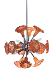 Our fabulous Yuri Orange 6 LT Hanging Fixture is a dazzling addition to any décor style in your home. The fixture features a round metal base, finished in gleaming Polished Chrome that is hung from a matching metal support tube. A series of 12 large Hand Blown Art Glass flowers in bright purple radiate outward from the base in an eye- catching pattern. Because each blossom is hand blown, no 2 are exactly alike which means that your fixture is a one of a kind work of art. The fixture is illuminated by 6 candelabra bulbs (not included) whose light will be reflected off the glass and into the room when the fixture is illuminated. A magnificent choice over a dining area, our Yuri Orange 6 LT Hand Blown Hanging Fixture also makes a great way to greet guests when hung in foyers or entryways with higher ceilings.