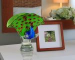 Our Favrile Art Glass Collection figurines and sculptures are an excellent way to showcase your taste and style that is designed to last for generations. Our charismatic Peacock figurine is a colorful addition anywhere in your home. His body is a vivid shade of cerulean blue with a red crest on top of his head. His train of feathers fans out behind his body in a bright green background with red, yellow, orange and black highlights. The base is solid clear glass, which gives the figurine its solid feel. You will be proud as a peacock to have this colorful fowl strutting about in any room of your home or office.
