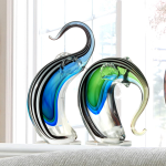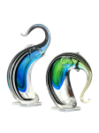 The flowing lines and vivid colors of our 2 Piece Elephant Sculpture will be an enchanting touch in any decor style in your home or office. This pair of pachyderms has been lovingly handcrafted in Favrile Art Glass in the Deco style. Each elephant begins with clear glass, which is accented beginning at the base of the body in deep sky blue and lush green that fade gently along the contours of their bodies and their fluid trunks. Bold brown and white striping run along the backs, continuing to the tip of their graceful trunks. One is depicted in aggressive trumpeting stance while the other is rendered in a more restful pose with his trunk pointed downward. Each features realistically rendered ears and stylized mouths. Either piece is lovely displayed on its own, but both displayed together makes a truly magnificent statement that will majestically grace any home or office for a lifetime.