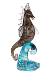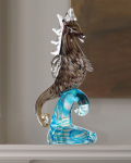 Our enchanting Sea Horse Figurine is sure to make a big splash in any room of your home. His meticulously detailed body boasts a background of white, yellow and blue, with swirls of deep purple for a mesmerizing effect from the tip of his nose to the curled base of his tail. His striking face is highlighted by a realistically formed nose and bright, expressive eyes. His colorful body is framed by a clear mane and fins, which provide excellent contrast and authenticity. He is shown riding the crest of a clear wave that is accented with ribbons of nautical blue. A lovely gift for yourself or the aquatic enthusiast, our Sea Horse Figurine is a delightful addition to any decor that will be proudly displayed for years to come.