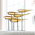 Always at the forefront of home design trends, Dale Tiffany is pleased to present our new collection of Fish Sculptures. Each sculpture portrays a school of stylized, elongated tropical fish that are Handcrafted using our superior quality art glass. Grouped together, each fish seem to be swimming in synchronous motion with the rest, giving the overall piece an appearance of fluid motion. Standing over 1 ½ feet in height, these unique pieces command attention and will easily become the focal point in any room. This 5 Piece Amber Fish Sculpture features 5 bright fish in sunny shades of amber, white and cream. Each fish sits in a bracket atop a stake that is mounted on a rectangular base. The perfect gift for the aquatic enthusiast or anyone who appreciates the new and exotic, our Art Glass Fish Sculptures make the perfect pet…no care or feeding required.