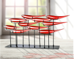 Always at the forefront of home design trends, Dale Tiffany is pleased to present our new collection of Fish Sculptures. Each sculpture portrays a school of stylized, elongated tropical fish that are hand blown using our superior quality art glass. Grouped together, each fish seem to be swimming in synchronous motion with the rest, giving the overall piece an appearance of fluid motion. Standing over 1 ½ feet in height, these unique pieces command attention and will easily become the focal point in any room. This 10 Piece Red Fish Sculpture features 10 vibrant fish in bold shades of crimson, white and black. Each fish sits in a bracket atop a stake that is mounted on a rectangular base. The perfect gift for the aquatic enthusiast or anyone who appreciates the new and exotic, our Art Glass Fish Sculptures make the perfect pet…no care or feeding required.