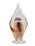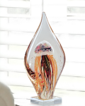 Bold, warm color meets cool clear glass, giving our Madera Sculpture a fire and ice look that will accentuate any decor in your home. The freeform sculpture features a base of hand blown cool Favrile bubble glass into which an abstract jellyfish in warm yellow, red, amber and cool black and blue is suspended. The clever combination of the bubbles within the glass and color tendrils creates the impression of the jellyfish floating effortlessly through water. The perfect gift for yourself or the aquatic enthusiast, our Madera Sculpture is sure to become a treasured memento to be enjoyed for many years to come.