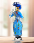 Her exquisite grace and beauty transcend time. Our Arciala Figurine is a lovely marriage of vintage style and up to the minute flair. This charming figurine depicts a Victorian era beauty, smartly turned out in all her period finery. The Favrile glass figure is sharply attired in an ankle length frock of brilliant cerulean blue and white. Her dress is accented with yellow, black and amber at the hips and clear glass ruffles down the sides and at the bottom of her skirt and front of her blouse. Her face is a lovely shade of flesh tone pink, with ruby red lips and jet-black hair. She is beautifully accessorized with period black ankle boots and a jaunty oversized fedora in the same blue as her dress. The perfect gift for yourself or that special fashionista, our Arciala figurine is destined to become an heirloom piece that will be cherished for generations.