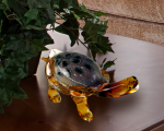 Tenacious and colorful, our Tracy Turtle Art Glass Sculpture is determined to walk into your family’s heart. This steadfast little amphibian features a body of golden amber art glass. Her magnificent shell is a gorgeous blend of charcoal and black that is encircled in a clear glass border. A lively addition to a den, study or family room, Tracy Turtle is completely hand blown, using Favrile Art Glass, meaning no 2 pieces are exactly alike. This ensures that yours is a one of a kind work of art that you will proudly pass down from one generation to the next.