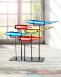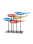 Always at the forefront of home design trends, Dale Tiffany is pleased to present our new collection of Fish Sculptures. Each sculpture portrays a school of stylized, elongated tropical fish that are Handcrafted using our superior quality art glass. Grouped together, each fish seem to be swimming in synchronous motion with the rest, giving the overall piece an appearance of fluid motion. Standing over 1 ½ feet in height, these unique pieces command attention and will easily become the focal point in any room. This 5 Piece Multicolored Fish Sculpture features 5 bright fish in sunny shades of amber, red and blue. Each fish sits in a bracket atop a stake that is mounted on a rectangular base. The perfect gift for the aquatic enthusiast or anyone who appreciates the new and exotic, our Art Glass Fish Sculptures make the perfect pet…no care or feeding required.