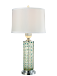 The liquid beauty and contemporary lines of our Raindance Table Lamp is the perfect addition to any decor. The center column is surrounded by clear crystal with teal art glass accents, which create the illusion of raindrops flowing downward over the fixture. We topped Raindance with an elegantly simple drum shade in crisp white fabric that will diffuse the light from our dimmable LED module. The metal base is a sleek stepped pedestal that is finished in shimmery Polished Chrome, that provides balance to the overall fixture. Our Raindance Table Lamp is perfect for end tables and nightstands in any decor.