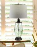 Our beautiful Vale Painted Crystal Table Lamp adds an instant decorator’s touch to any room in your home or office. The tall fixture features a center column that is enveloped with a large urn with painted crystal hand blown. The crystal is faceted in a looping pattern with gentle highlights of blue and green throughout. The metal base is finished in dark Ebony Black and features a sleek vase cap and pedestal atop a solid black marble round base. We topped Vale with a drum shade in crisp white fabric and added a complementary finial to complete the upscale look. A perfect choice for living rooms, bedrooms, dens or offices, our Vale Painted Crystal Table Lamp will provide you with many years of chic, reliable lighting.