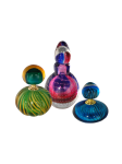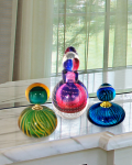 A bevy of colorful beauty, our Apollo 3 PC Perfume Bottle set is sure to please even the most discriminating aficionado. The set features a round bottle with green and amber swirled stripes that is topped with a round stopper with a green center that is encased in matching amber. A second striped bottle is a shorter oval with a cobalt blue base, highlighted with darker blue stripes and is topped with a matching stopper. The third bottle in the collection features clear bubble glass that is infused with shades of pink, red and blue both in the bottle and the matching stopper. A perfect gift for the serious collector, the set can be easily split into separate gifts. No matter what you choose, you simply cannot go wrong with our Apollo 3 PC Perfume Bottle set.