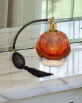 Our Indiana Perfume Bottle will make a warm statement in your lovely home. The hexagonal shaped bottle begins with clear glass that is infused with bright, burnished amber throughout that will be ablaze with color when it reflects the light. The base is clear, which provides a nice contrast to the amber and adds to the overall sense of balance. Indiana is topped with a golden metal sprayer and tasseled atomizer, making it a fully functional perfume atomizer. Indiana does double duty as functional one of a kind work of art that you will proudly display anywhere in your home for many years to come.