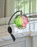 Our Crystal Prism Perfume Bottle is an enchanting combination of beautiful form and practical functionality. The round bottle is faceted and features a base of clear Favrile bubble glass. One half of the bottle is infused with light emerald green, the other a delicate purple. Each color begins lighter at the center and darkens ever so slightly at the outside edge for a lively prismatic effect when the bottle catches the light. Crystal Prism is topped with a silver tone cap that includes a tasseled atomizer in black fabric. The bottle is hand crafted of Favrile Art Glass, which means no 2 are exactly alike and guarantees that yours will be an unmatched work of functional art. A pretty finishing piece on a dresser or vanity, our Crystal Prism Perfume bottle is not merely decorative, it is a working perfume atomizer that when filled with your favorite fragrance will provide you with years of elegant, artistic service.
