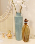 Always at the forefront of home design trends, Dale Tiffany is pleased to present our Favrile Art Glass Collection Home Accents. The collection features an array of one of kind items that are a superb blend of form and function that will easily enhance any decor style. Delicately beautiful, this Tall Wheat Vase’s sleek lines and superior craftsmanship will command attention in any room in which it is displayed. The elongated bottle style vase is adorned with graceful brush strokes of amber, cream, brown, tan and glitter swirled together to create the impression of wheat stalks swaying in a gentle summer breeze. The bottle tapers, then flares at the neck and is topped by a stopper with a chipper bird in matching colors. A pretty centerpiece on a dining table, console or entryway table, our Tall Wheat Vase also makes the ideal bridal or housewarming gift.
