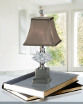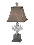 The unique blending of mixed media in our Lucinda crystal accent lamp adds just the right finishing touch to any decor style. A flared shade in silver fabric sits atop a metal column. The star of the show is a generously sized, multifaceted crystal lotus blossom, which sits atop a flared metal base. The faceting in the flower petals is designed for maximum light refraction when the lamp is lit. A square base, sitting atop a beveled pedestal and faceted crystal orb finial completes the look. Lucinda’s neutral coloring makes it the perfect accent lamp in any decor and adds an instant decorator’s touch to your home or office that you will be proud to display for many years to come.