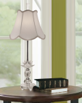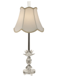 Elegant and sophisticated, our Abby Crystal Table Lamp will add an instant decorator’s touch to your lovely home. The sleek center column, finished in cool polished chrome sits atop a round glass pedestal with matching ball feet. Just above the base sits a crystal pedestal and large faceted orb, which are separated by metal column breaks. A beautifully faceted solid crystal lotus blossom is the star of the show, reflecting showers of sparkles about the room when Abby is lit. We’ve topped Abby with a graceful scalloped shade in crisp white fabric and a solid crystal tapered finial that ties the look together. Lovely on its own, try displaying Abby in pairs on a console table or matching end tables or nightstands for a truly magnificent look that you will enjoy for many years to come.