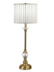 Our stately Tavon 24% Lead Crystal Buffet Lamp elegantly simple design easily assimilates into any décor. The tall fixture’s metal base is finished in Antique Brass and features a sleek center column and deep pedestal base. We added a 24% lead crystal faceted candle cup at the top of the center column and a lightly faceted orb, also crafted of 24% lead crystal just above the base. We paired Tavon with a pleated drum shade in white to direct the lamplight downward over the crystal and added a crystal finial to tie the look together. A perfect choice when displayed in pairs on a buffet or console table, Our Tavon 24% Lead Crystal Buffet Lamp is destined to become a treasured family favorite you will display for years to come.