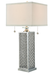 The sleek lines and contemporary style of this wonderful Crystal Table Lamp will easily assimilate into any decor. The tall fixture features a square metal framework surrounding the center column. Each of the 4 sides features a rectangular inset of metal bars set in a crosshatch pattern, forming a diamond shaped opening. Inside each, a faceted crystal bead hangs freely to create a feeling of movement. The framework, bars and square pedestal are all finished gleaming Polished Chrome. We have paired the base with a square shade in crisp white fabric that will direct the light from the lamp downward over the crystal and chrome for a stunning display of sparkle. The finial and dual chain pulls are also solid crystal for added shine. A truly opulent addition to matching end tables or nightstands, our Crystal Table Lamp is built to last, providing your family with many years of reliable, opulent lighting.