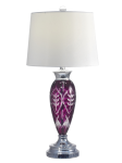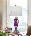 Our Cayman 24% Lead Hand Cut Crystal Table Lamp is elegance personified that will beautify any decor in your home. The metal on the lamp base is the perfect accompaniment to the brilliant purple color in the crystal center column. We topped the Cayman with a elegant simple fabric shade, designed to direct light downward over the crystal to complete the look.