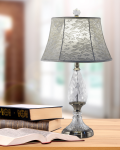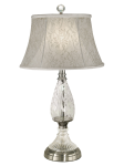 The Wavy Leaf 24% Lead Hand Cut Crystal Table Lamp is a delightful blend of textures that will easily accentuate any décor style. The center column is enveloped with an inverted crystal teardrop that is faceted in a lovely leaf pattern. The metal base is finished in Brushed Nickel and features a receded crystal flange atop the pedestal round. We topped Wavy Leaf with a gently flared shade in natural fabric and finished it off with a smooth orb crystal finial. A natural choice for nightstands and end tables, try displaying our Wavy Leaf Crystal Table in pairs or multiples for a look you will enjoy for many years to come.