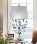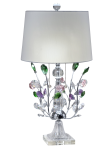 Our fantastic Vibrant Blossom Crystal Table Lamp will live up to its name by adding a touch of floral elegance to any room in your home. The tall fixture features a metal base that is finished in glistening Polished Chrome to increase sparkle. Just under a solid crystal half-orb column break, a series of metal branches with cut crystal blossoms and leaves in delicate shades of pink, purple, blue, green and clear radiate outward from the center column. A flanged base and square pedestal, both of solid crystal provide stability and extra sparkle. We topped Vibrant Blossom with a simple drum shade in crisp white fabric and crystal orb finial. The shade will direct the lamplight downward over the cut crystal blossoms to refract the light outward into your room in a kaleidoscope of multicolored sparkles. Perfect on end tables or nightstands, our Vibrant Blossom Crystal Table Lamp is destined to become a cherished family heirloom to be passed from one generation to the next.
