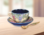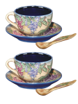 Our Grape Vine 2-PC Hand Painted Porcelain Cup and Saucer Set does double duty as both lovely objet d’ art and functional teacup and saucer set. The package includes a pair of teacups crafted of hand painted Favrile art glass. Each cup has a light yellow background, featuring a leafy green grape vine with clusters of red and purple grapes. The interior cup wall and is a deep azure blue, which provides excellent contrast. The matching saucers feature the same floral design on the face as well as matching azure bottom, both of which are carried over to the over to the included matching teaspoons. All pieces are hand painted which means that no 2 pieces are exactly alike. Our Grape Vine 2-PC Hand Painted Porcelain Cup and Saucer Set also makes a lovely gift for the tea enthusiast or any special occasion.