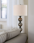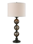 The kaleidoscope of colors in this table lamp from our Mosaic Art Glass Collection will add unique visual interest to any room in which it is displayed. The column features 3 orb shapes. Each is covered with art glass meticulously hand set in a mosaic pattern. Shades of green, amber, copper and brown seem to change color when viewed from different changing angles. Our designers have chosen a creamy fabric drum shade to highlight the dramatic appeal of the mosaic patterned art glass. A simple metal pedestal, finished in dark antique bronze provides an excellent backdrop for this one of a kind stunner.