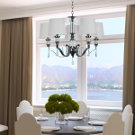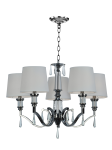 Our Eliza 5 LT Chandelier features sleek, modern lines with a vintage twist that will enhance any decor style. The fixture’s metal base, finished in gleaming Chrome, features 3 generously sized solid crystal pieces wrapped around the center column. Each is separated by a metal column break that is finished to match the base. 5 curved metal arms extend upward from the fount, each topped by a crystal disk just under the candle plate and candelabra base. A crisp white fabric shade tops each, which gently diffuses the light when the chandelier is illuminated. At the top of the fixture is a ring of elongated crystal teardrops for added sparkle. We have also placed larger crystal teardrops at points around the bottom of the fixture for balance and extra glamour. Eliza hangs from a metal ceiling canopy and chain, which are finished to match in shimmery chrome. A lovely way to top a formal dining area, our Eliza 5 LT Chandelier also makes a grand way to greet your guests in entryways or foyers with high ceilings.