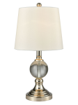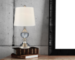 Elegance in simplicity, our lovely Chartham Crystal Table Lamp both assimilates and accentuates any decor in your home or office. The center column is enveloped in a generously sized orb of solid crystal. Smooth and unfaceted, the crystal’s beauty speaks for itself. Chartham sits atop a round stepped pedestal that is finished in smooth Satin Nickel with a matching vase cap. We paired the fixture with a crisp white fabric drum shade and smooth crystal finial to complete the look. Perfect when displayed on matching end tables or nightstands, our Chartham Crystal Table Lamp also makes a lovely desk lamp on larger workstations.