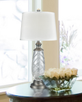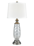 The Lake Butler 24% Lead Hand Cut Crystal Table Lamp's glistening sparkle will add style to any decor in your home. The high quality metal is the perfect accompaniment to the ornately carved crystal in the center column . Its topped off with a simple elegant fabric drum shade designed to direct the light downward over the crystal to complete the look.