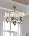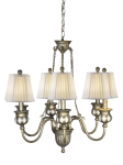 Our lovely Evita 6 LT Chandelier features vintage styling with a contemporary twist to ensure it will be the ideal addition to any décor. The chandelier’s base is finely crafted of metal that is finished in burnished Antique Bronze. At the bottom of the fixture a beautiful glass fount reflects the lamplight back out into the room when Evita is lit. Just above, a second metal fount is the base for 6 elegantly scrolled arms, each curving upward to end in a round candle cup with round glass insets. We topped each with a pleated white fabric shade and matching finial. Evita hangs from a metal ceiling canopy and wire cable/chain that are finished in matching Antique Bronze. Perfect over a large dining area, our Evita 6 LT Chandelier is destined to become a treasured family favorite.