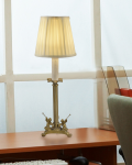 Our Angel Buffet Lamp is a heavenly addition to any décor in your home. The tall fixture begins with a metal base, finished in Antique Golden Silver that features a reeded center column. A pair of matching angels kneel on the rectangular footed pedestal. Cast in meticulous detail, each cherub holds a trumpet that is so realistic you will almost hear their angelic tune. We topped the fixture with a simple shade in pleated natural fabric to enhance the beauty of the finish. Great on buffets or consoles, try displaying our Angel Buffet Lamp for a look that is truly divine.