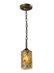 Variegated shades of amber art glass, set in a mosaic pattern are a delightful blend of retro style and sleek, modern lines. Each piece of glass is individually set by hand, ensuring that no two pieces are exactly alike. This means that not only is this pendant a functional lighting fixture but also one of a kind work of art. The shade is suspended from a metal ceiling canopy, decorative chain and vase cap, all finished in a burnished antique golden sand. Lovely when hung alone, this pendant makes a stunning display hung in multiples over a kitchen island or breakfast nook.