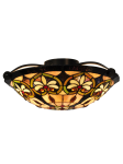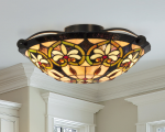 Colorful and bright, our Peony Semi-Flush Mount fixture will add rich warmth to any room in your home. The generously sized inverted bowl shade features a background of sunny bright amber art glass, accented with bold filigree. A large peony blossom in white, green and amber sits at the center of the shade’s bottom edge. A large amber glass jewel dots the flower’s center. Along the top, a row of fleur de lis in matching shades is surrounded with a heart shaped border and accented with a deep amber border and insets. More amber glass gems and jewels have been set throughout the design for added texture and sparkle. The fixture hangs from a metal canopy and support tubes, finished in authentic Tiffany Bronze. Our Peony Semi-Flush Mount fixture is perfect over a casual dining table and makes an inviting way to greet guests when used in a foyer or entryway.