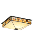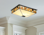 The bright colors and textures of our Sundance Flush Mount will add homey warmth to any room. The square shade features 4 large triangular panels of sunny amber art glass that come together to form a point at the art glass jewel finial at the bottom. Sundance’s sides are crafted of dual rows of art glass squares in variegated shades of amber. We have placed additional art glass jewels in complementary colors throughout to add even more color and sparkle. Sundance comes wired with our innovative LED module with a life expectancy of approximately 50,000 hours that will provide you with years of worry free, energy efficient lighting. The fixture hangs from a metal base finished in rich Tiffany Bronze that perfectly accentuates the colors in the shade. A lively choice over an informal dining area, our Sundance Flush Mount is a great fixture for kitchens, bedrooms, hallways or entryways.