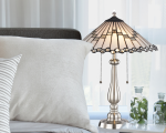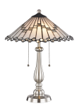 The icy, crisp tones in our Jensen Table Lamp create a look that will easily accentuate any decor style. The cone shade is crafted of thin wedges of art glass in creamy natural that are set in bold filigree. The center circumference features a wave design of frosted glass squares that adds a lovely texture to the gentle glow of the background. The shade’s bottom edge is bordered with pairs of clear art glass gems, set at angles to mimic the pattern in the shade. The metal base features a rounded bottom center column that sits atop a complementary base and pedestal round, all fished in sinuously cool Brushed nickel. A column break just under the shade is finished to match the base to add extra visual interest. A great choice for end tables or nightstands, our Jensen Table Lamp also makes a very one of a kind desk lamp on larger desks or work areas... A great choice for end tables or nightstands, our Jensen Table Lamp also makes a very one of a kind desk lamp on larger desks or work areas.