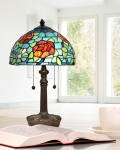 This pretty Crimson Rose Table Lamp is a lovely addition to any room in your home or office. Bright red rose blossoms in an alternating high low pattern are set against a bright blue background of slate shaped art glass panels. Touches of green leaves, blue-green vines and white accents add to the natural feel of the lamp. An iridescent blue border at the shade’s top and bottom perfectly highlights the floral design. The lovely metal base is finished in Antique Bronze and features a tree trunk motif atop a thick, footed pedestal. A matching vase cap and flame finial completes the look and adds balance to the overall design. A lovely choice on matching end tables or nightstands, our Crimson Rose Table Lamp will provide you with years of artistically reliable lighting.