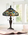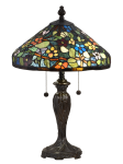 Our Southern Floral Table Lamp adds gentle touches of grace and charm to any room in your home or office. The generously sized cone shade begins with a background of azure blue art glass that provides the perfect showcase for an allover floral and fruit design in a multitude of rich colors that will shine brightly when the lamp is illuminated. The shade’s bottom edge is bordered in a ribbon of dark amber for added color and texture. The metal base is finished in deep Fieldstone and features a lovely cast pattern that wraps and drapes around the center column down to the footed pedestal base. A matching vase cap and flame finial completes the look. Perfect on matching end tables or nightstands, our Southern Floral Table Lamp is destined to become a treasured family favorite for years to come.